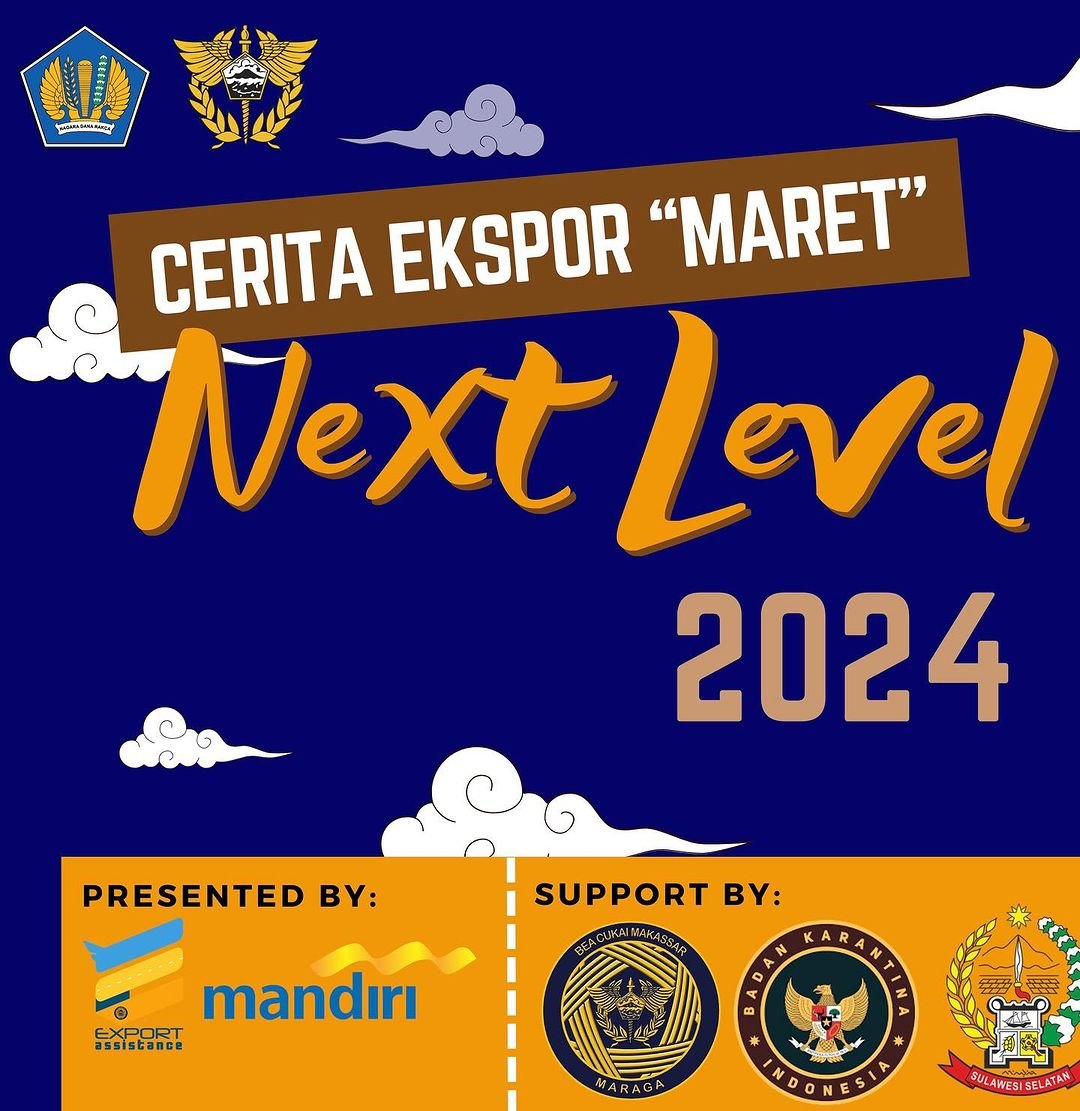Acara Program Cerita Ekspor “Next Level” Tahun 2024 akan diadakan pada Hari Rabu, 27 Maret 2024, pukul 14.00 WITA, di Mandiri Export House (Bank Mandiri), Jl. R. A. Kartini No. 19, Makassar.