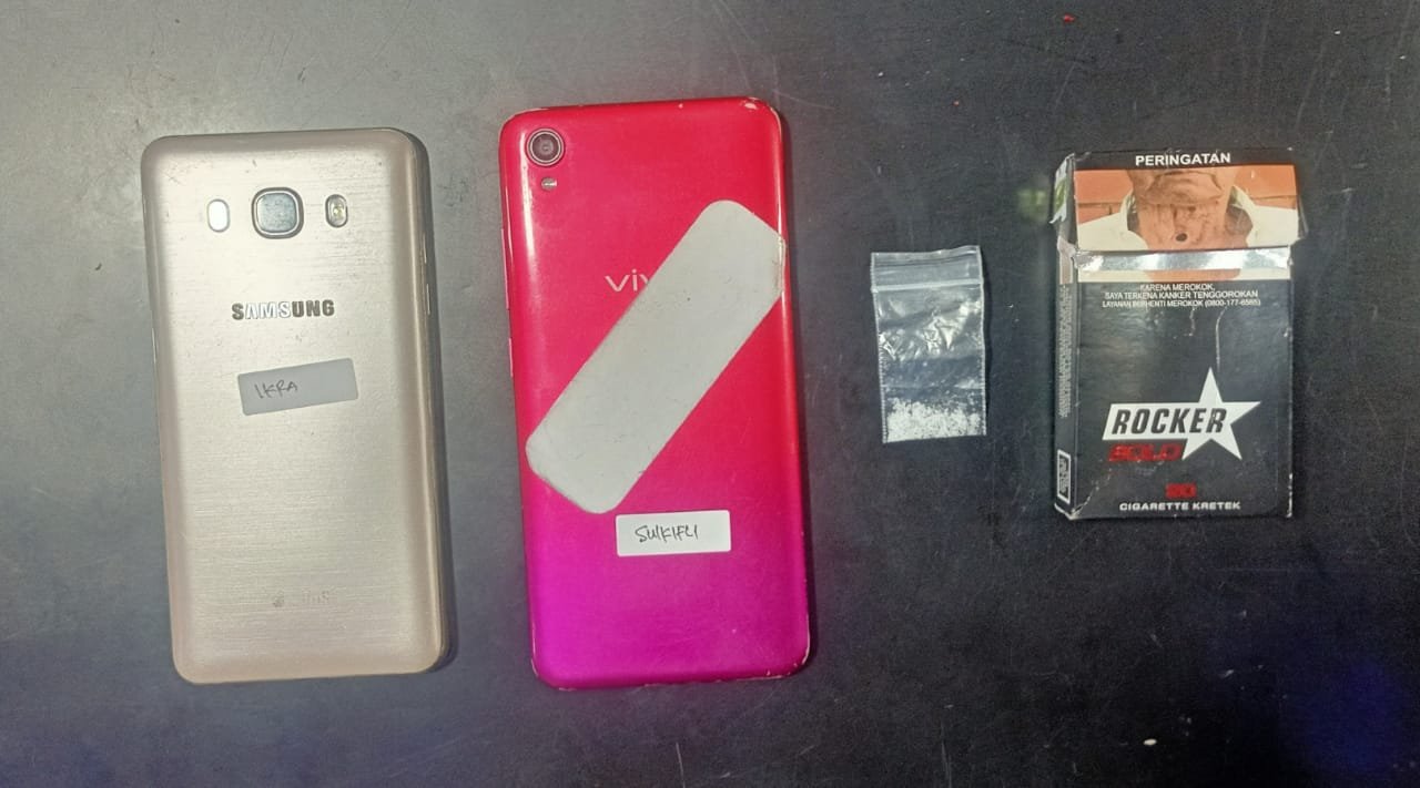 1 pembungkus rokok merk Roker, 1 sachet kristal bening dalam plastik klip kecil, 1 unit handphone merk VIVO warna merah, dan 1 unit handphone merk Samsung warna Silver dengan nomor SIM card.