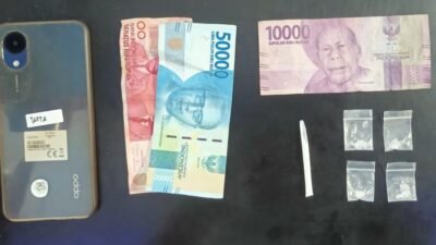 Barang bukti yang ditemukan meliputi uang sebesar Rp. 10.000,-, 4 sachet sabu ukuran kecil dalam plastik klip/bening, 1 buah sendok takar dari pipet plastik, uang sebesar Rp. 150.000,-, dan 1 unit handphone merk Oppo warna biru malam dengan nomor SIM card.