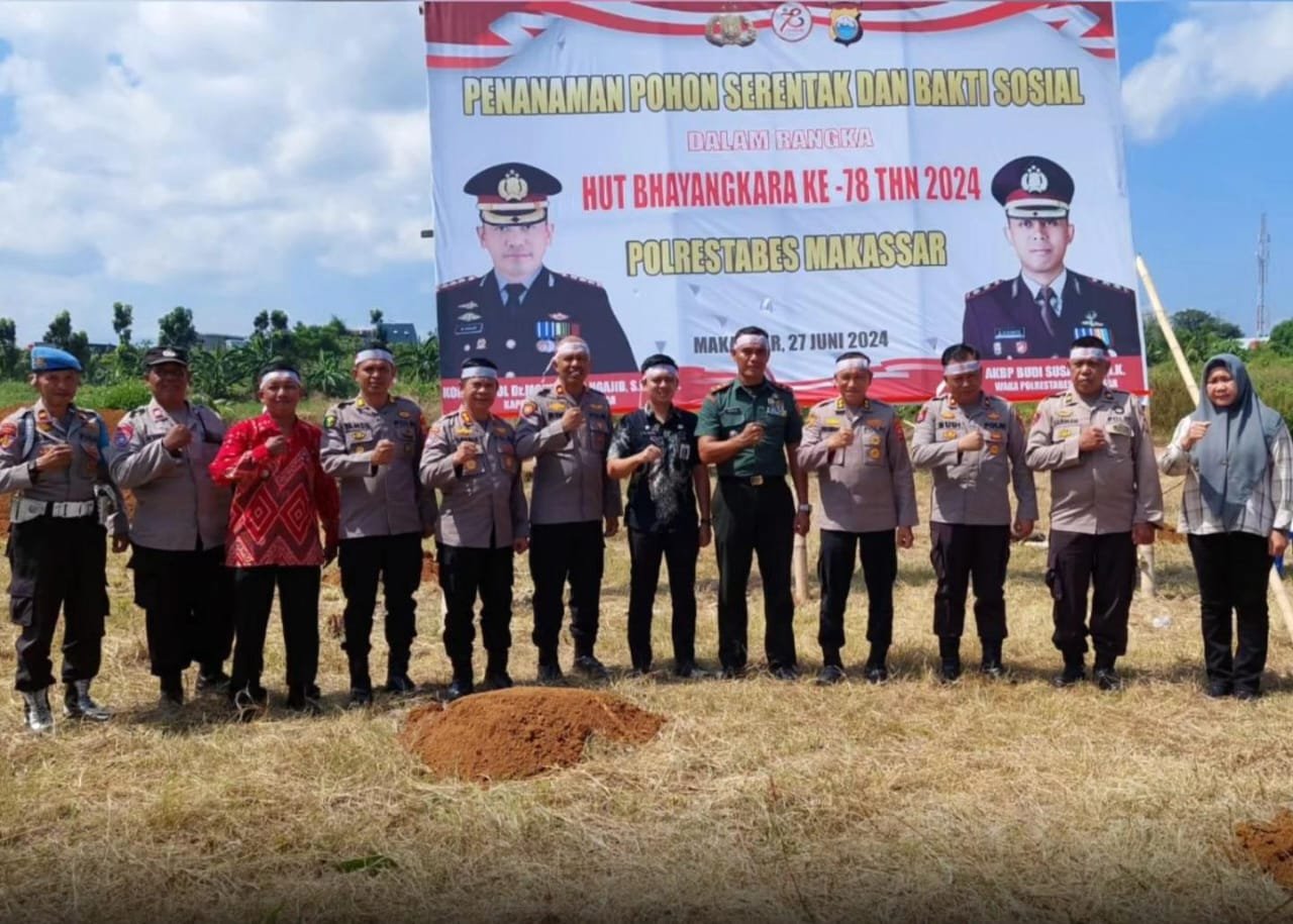 SSindonesia Makassar – Dalam rangka menyambut Hari Bhayangkara ke-78, Polrestabes Makassar menggelar kegiatan Penanaman Pohon Serentak dan Bakti Sosial di lahan Brimob Polda Sulsel, Jalan Poros Paccerakkang, Kelurahan Paccerakkang, Kecamatan Biringkanaya, Kota Makassar, pada Kamis (27/06/2024).