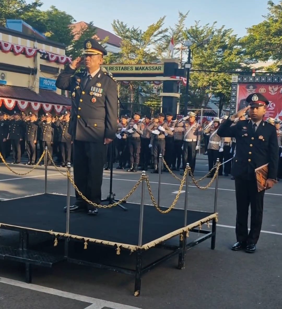 Makassar – Kepolisian Resor Kota Besar (Polrestabes) Makassar menggelar upacara peringatan Hari Ulang Tahun Kemerdekaan Republik Indonesia yang ke-79 di halaman apel Mako Polrestabes Makassar, Sabtu (17/8). Upacara ini dipimpin langsung oleh Kabag Ops Polrestabes Makassar, AKBP Darminto, S.Sos., dan dihadiri oleh Pejabat Utama (PJU), para Kasat, Kasie, Kapolsek, perwira, serta seluruh personil Polrestabes Makassar.