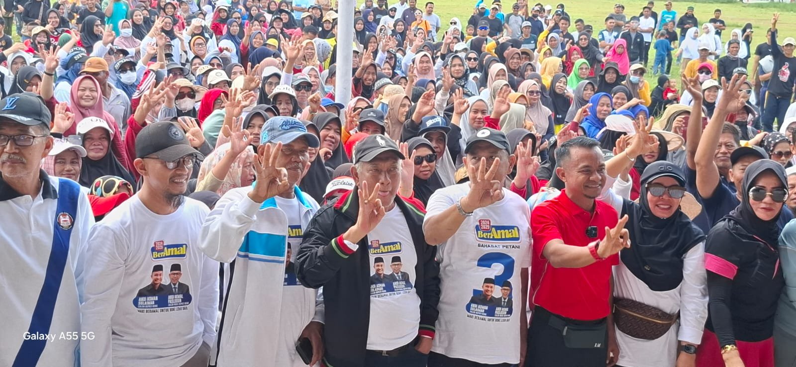 BONE-SSIndonesia.Co.Id. Tim PASLON BerAmal bergandengan owner Cahaya Mart Camming, Andi Cahaya menggelar jalan santai yang diikuti Ribuan warga Kecamatan Libureng bersama calon Bupati Bone, Andi Asman Sulaiman di lapangan Camming, Kelurahan Ceppaga, Sabtu, 12 Oktober 2024 pagi.