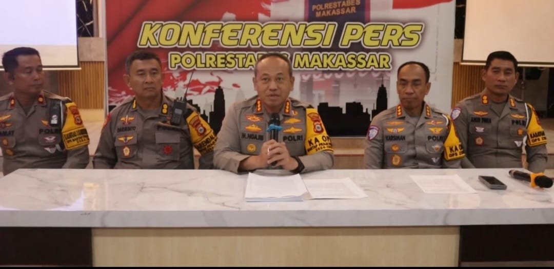 Makassar – Polrestabes Makassar memberikan keterangan resmi terkait perkembangan penanganan kasus kecelakaan lalu lintas di Tol Reformasi Makassar yang terjadi pada 25 September 2024, yang mengakibatkan dua korban meninggal dunia. Keterangan ini disampaikan langsung oleh Kapolrestabes Makassar, Kombes Pol Dr. Mokhamad Ngajib, SIK, MH, didampingi oleh Dir Lantas Polda Sulsel Kombes Pol Karsiman, S.I.K., M.M., Kabag Ops AKBP Darminto, dan Kasat Lantas Polrestabes Makassar Kompol Mamat Rahmat, pada Senin (14/10/2024) di Aula Mappaoddang Polrestabes Makassar.