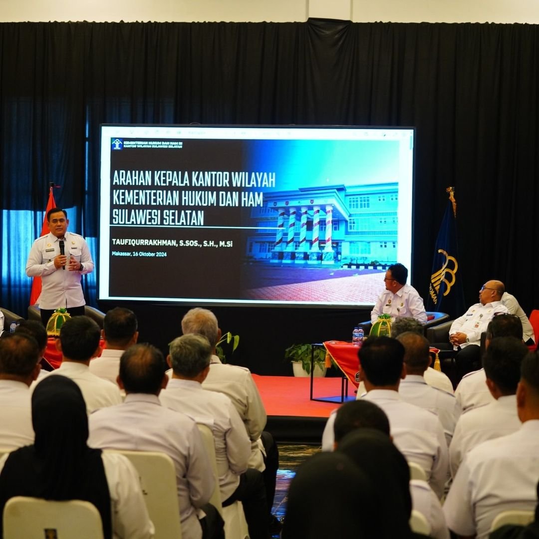 Makassar – Kepala Kantor Wilayah Kementerian Hukum dan HAM Sulawesi Selatan, Taufiqurrakhman, memberikan arahan penting kepada seluruh jajaran pada Satuan Kerja (Satker) Kanwil Kemenkumham Sulsel di Aula Pancasila, Rabu (16/10). Dalam kesempatan ini, Taufiqurrakhman menekankan pentingnya penerapan Tata Nilai PASTI dan Core Values Aparatur Sipil Negara (ASN) BerAKHLAK sebagai landasan utama dalam pelaksanaan tugas.
