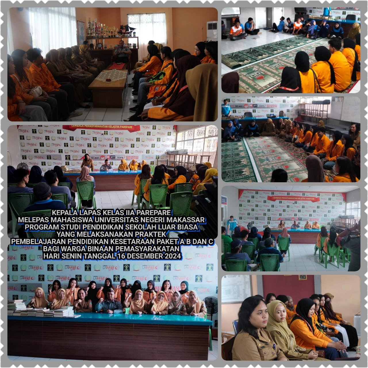 Parepare – Kepala Lembaga Pemasyarakatan (Lapas) Kelas IIA Parepare, Totok Budiyanto, A.Md.IP, S.H., melepas secara resmi 12 mahasiswa Universitas Negeri Makassar (UNM) Program Studi Pendidikan Luar Biasa (PLB) yang telah melaksanakan praktik mengajar pendidikan kesetaraan Paket A, B, dan C bagi 31 warga binaan pemasyarakatan (WBP). Pelepasan berlangsung pada Senin (16/12/2024) di aula Lapas IIA Parepare.