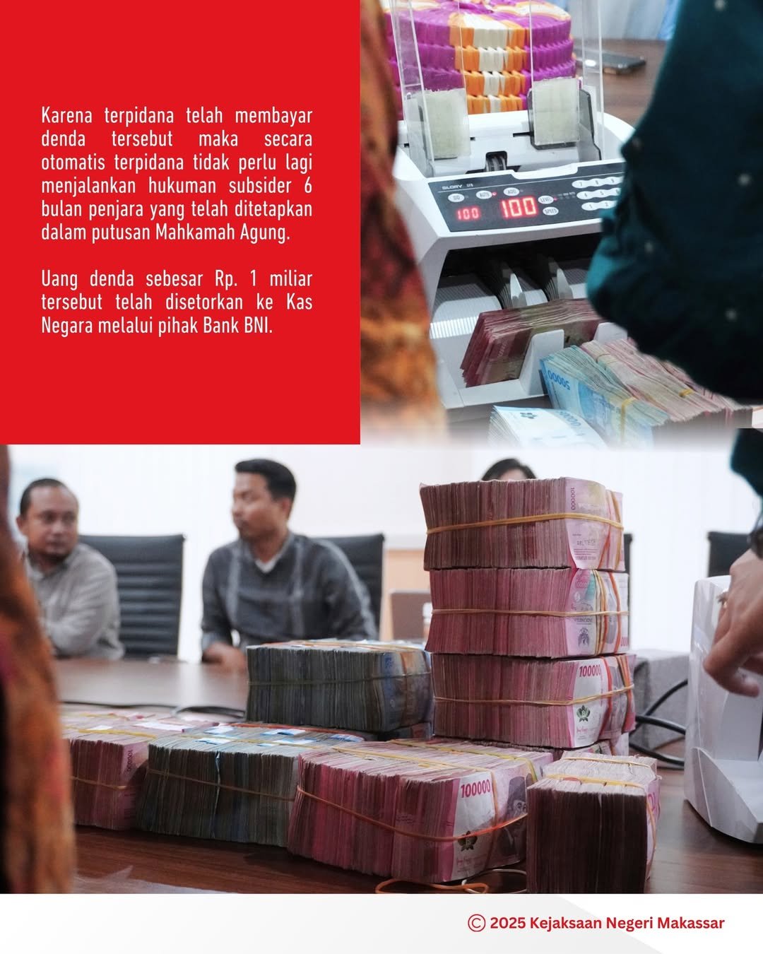 Uang denda sebesar Rp 1 miliar itu telah resmi disetorkan ke kas negara melalui Bank BNI sebagai bagian dari pemenuhan kewajiban hukum oleh terpidana.