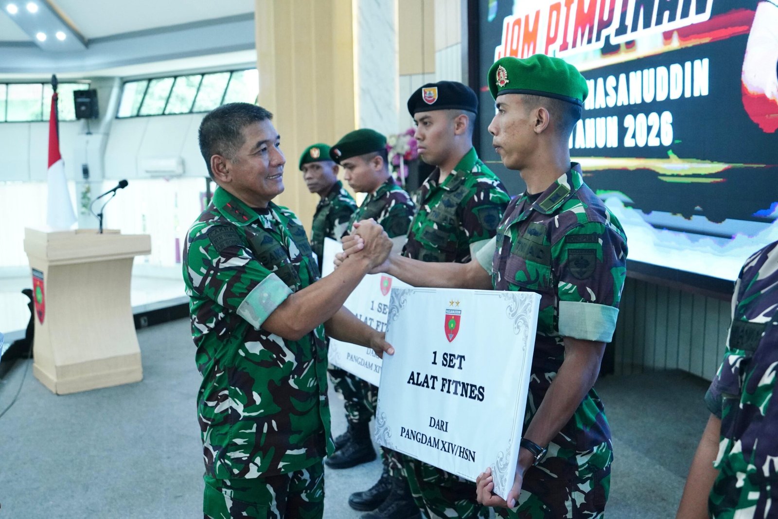 Makassar — Mengawali tahun 2026, Pangdam XIV/Hasanuddin Mayjen TNI Bangun Nawoko memberikan Jam Pimpinan kepada seluruh prajurit dan PNS di lingkungan Makodam XIV/Hasanuddin sebagai upaya memberikan motivasi serta memperkuat semangat pengabdian agar pelaksanaan tugas kedepan berjalan semakin optimal, dan profesional, yang dilaksanakan di Balai Pertemuan Hasanuddin (BPH), Jl. Urip Sumoharjo, Kota Makassar. Jumat (2/1/2026).