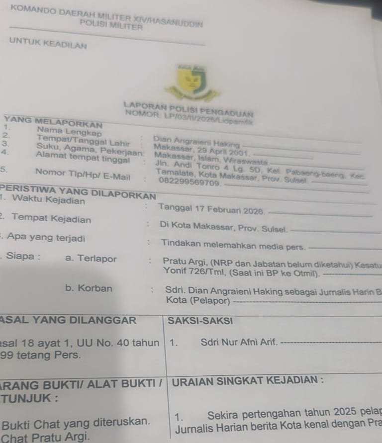 Makassar — Seorang jurnalis bernama Dian resmi melaporkan Pratu Argi, oknum prajurit TNI dari Yonif 726, ke Polisi Militer Kodam XIV/Hasanuddin. Laporan tersebut dilayangkan setelah Dian merasa karya jurnalistiknya dilecehkan dan dilemahkan melalui media sosial serta pesan WhatsApp yang beredar luas.